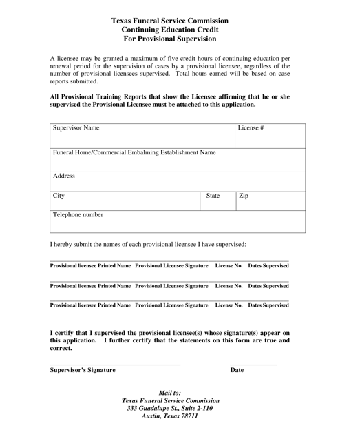 All work must be performed under the direct and personal supervision of a duly licensed funeral director or embalmer, depending on the provisional license. (2)aacommission means the texas funeral service commission. Anyone submitting an application for a provisional license must include the fdic letter (download microsoft word viewer) and the instruction on the provisional license program document.