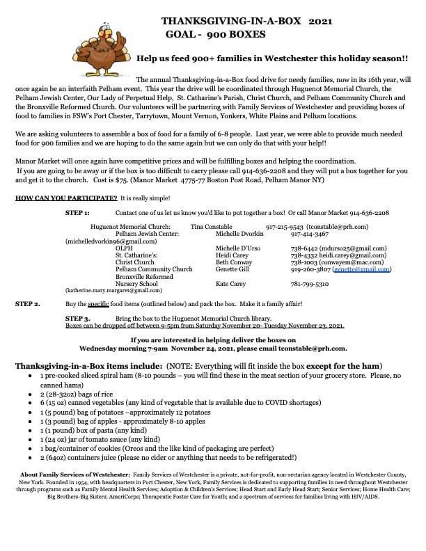 Family services of westchester (fsw) print. Pelham churches and synagogue create 300 thanksgiving boxes for family services of westchester clients.